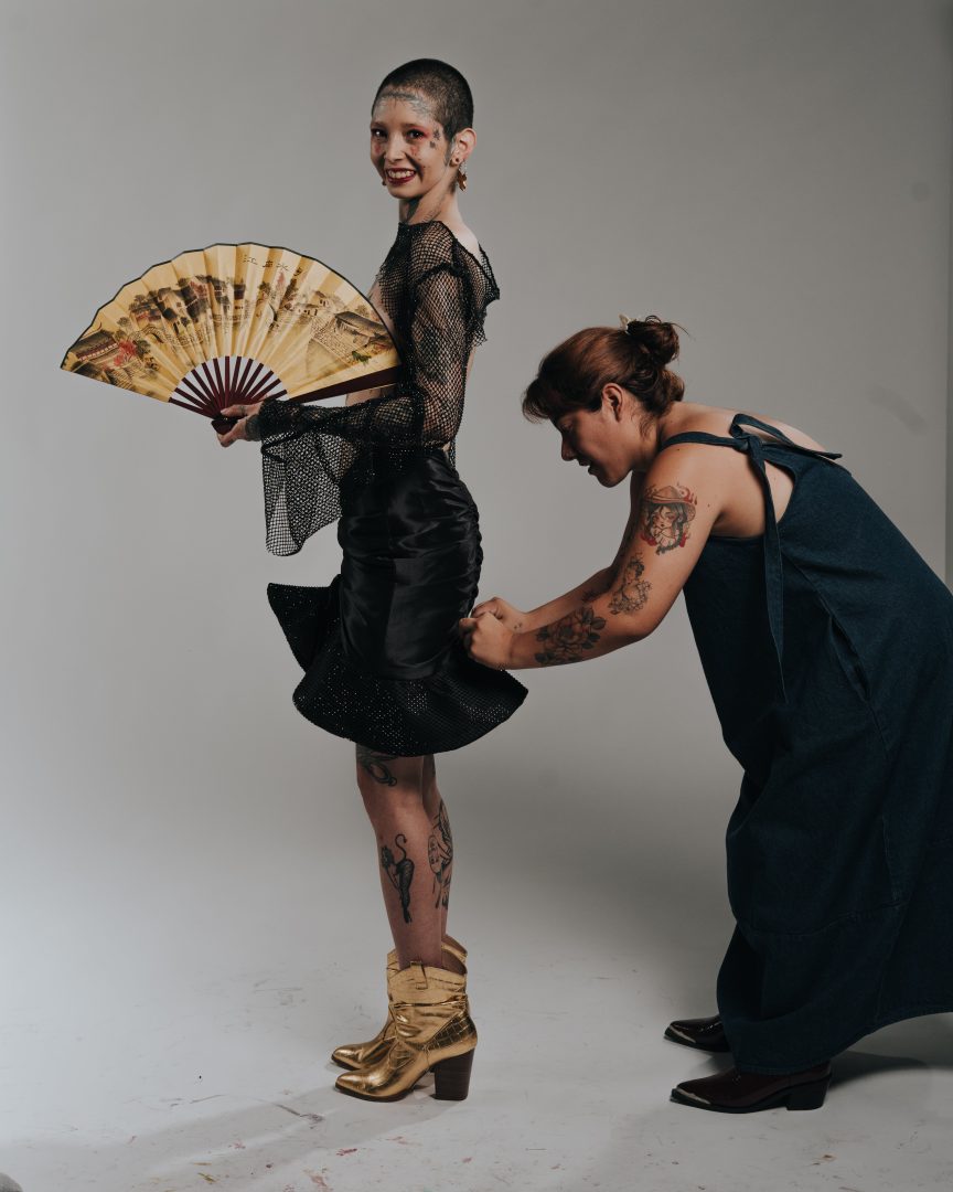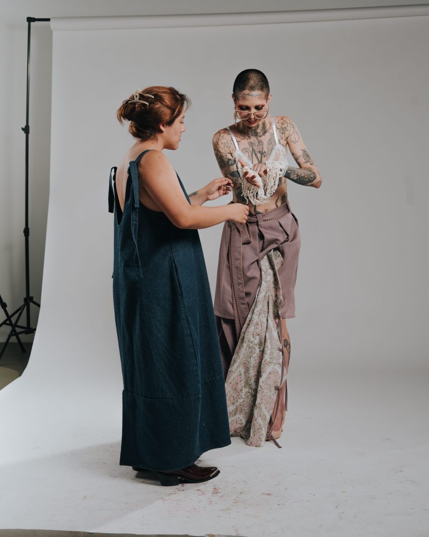 Melanie llegó al fitting y al shooting como quien trae consigo una mudanza completa de accesorios y prendas. La sesión se transformó en un viaje a la infancia: volver a jugar, a experimentar, a vestir muñecas, pero ahora con la madurez de una diseñadora que entiende la moda desde una mirada internacional.